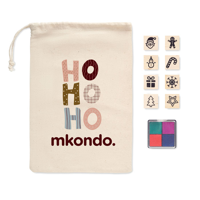 Lot de 8 tampons de Noël en bois dans un sac à cordon en coton. 4 Encreurs de couleur inclus.