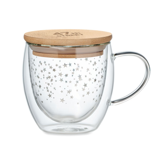 Tasse en borosilicate à double paroi avec design d'étoiles et couvercle en bambou. Capacité : 220 ml. Le bambou est un produit naturel, et présente de légères variations de couleur, de décoration et de tailles.