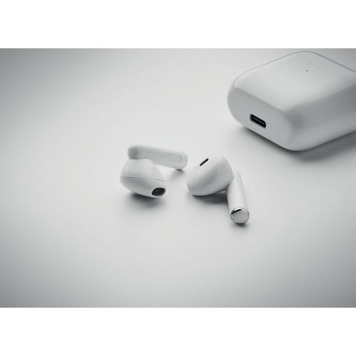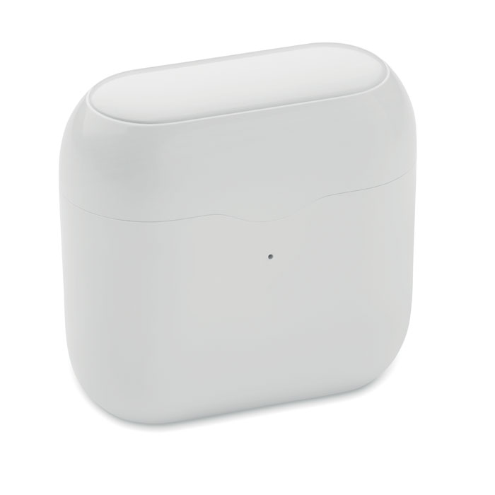 Écouteurs stéréo sans fil ABS True Wireless Stereo (TWS) 5.3 avec microphone, batterie 30 mAh et boîtier de charge 200 mAh. Durée d'écoute d'environ 4 heures. Appairage automatique.