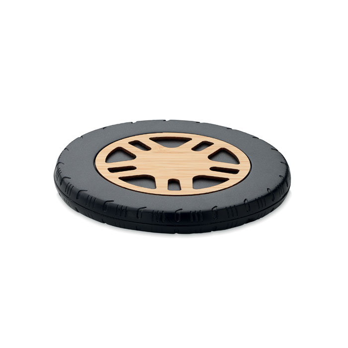 Chargeur sans fil 15W en ABS recyclé et dessus en bambou. Design de roue de voiture. Sortie : DC 9V/1.10A (15W) pour une charge rapide.