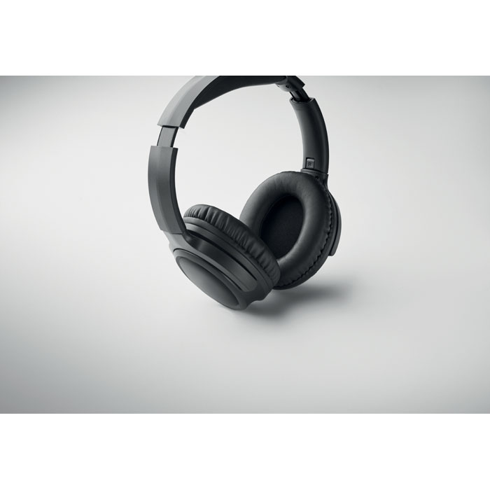 Casque sans fil pliable en ABS à réduction active du bruit (ANC) 5.3. Fonction mains libres et microphone. Autonomie d'env 17 heures. Câble de chargement Type-C inclus. Batterie Li-ION rechargeable de 200 mAh. Portée : 10 m.