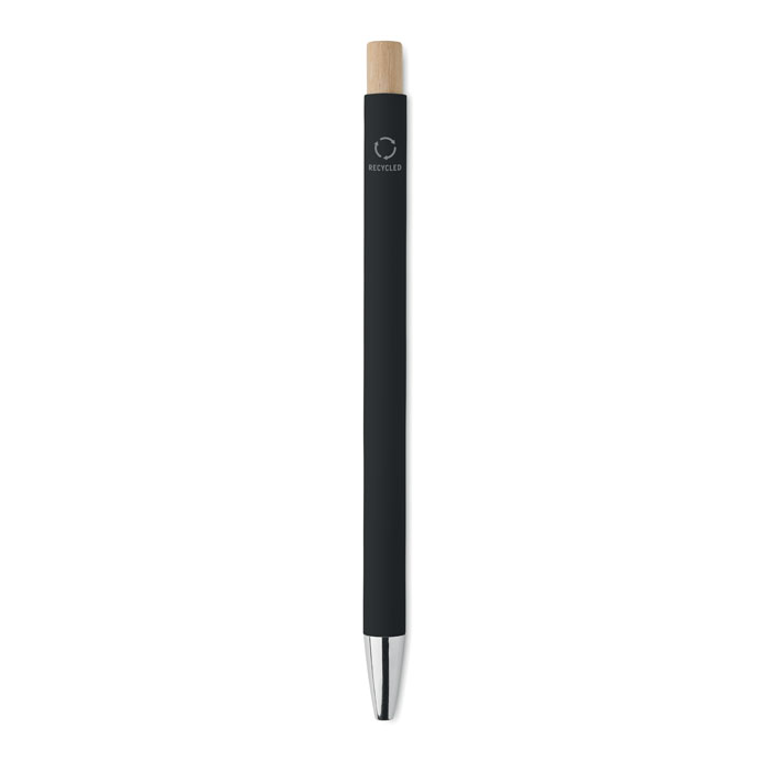 Stylo à bille en aluminium recyclé avec bouton poussoir en bambou. Pointe et clip argentés. Encre bleue.