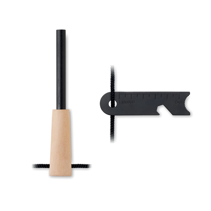 Allume-feu en pin et en acier inoxydable comprenant un bâton d'allumage, un grattoir polyvalent à utiliser avec votre allume-feu, un décapsuleur, une règle et une clé hexagonale.