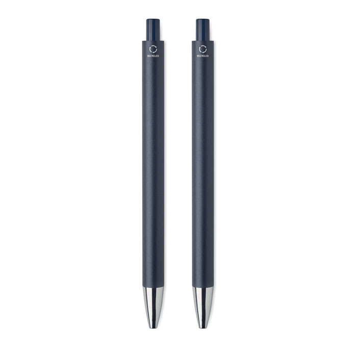 Parure de stylos en aluminium recyclé comprenant 1 stylo bille à poussoir (encre bleue) et 1 stylo graphite sans encre. Présentée dans une boîte en papier recyclé.