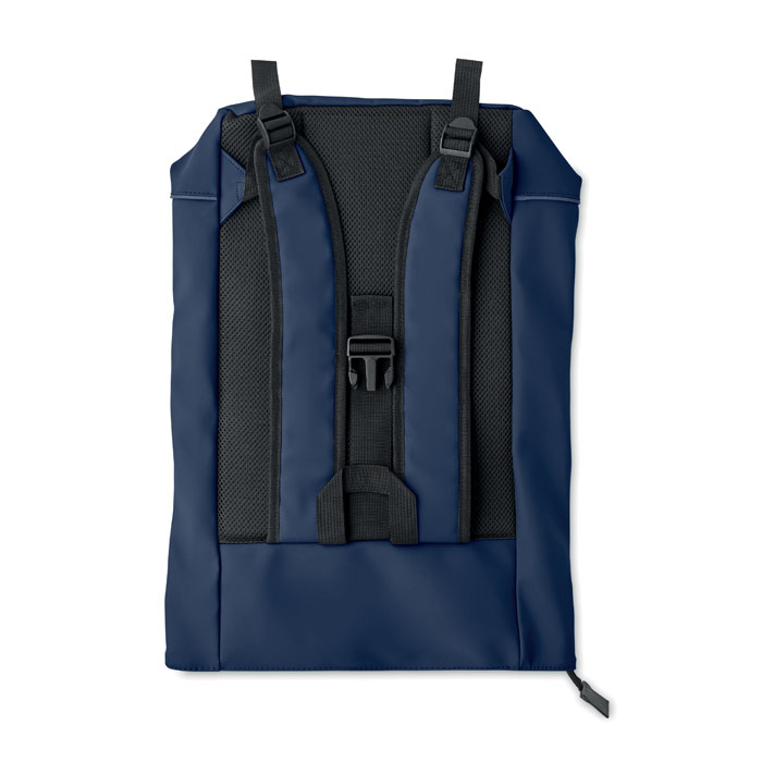 Sac à dos enroulable pour ordinateur portable 15 pouces en PU souple avec dos rembourré, base renforcée et bande réfléchissante. Poche frontale étanche avec fermeture éclair. doublure en polyester 210D RPET.