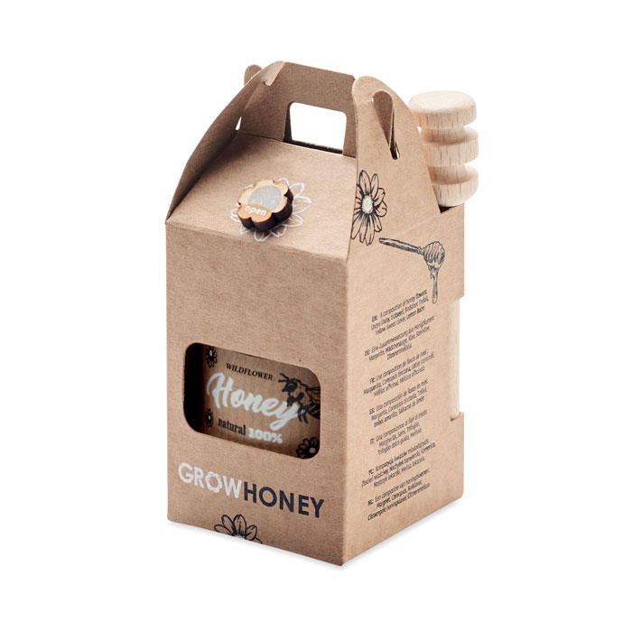 Pot de miel de fleurs sauvages (50g) avec une cuillère à miel en bois. Livré dans une boîte en papier kraft. Avec des graines de fleurs d'abeilles. Fabriqué dans l'UE.