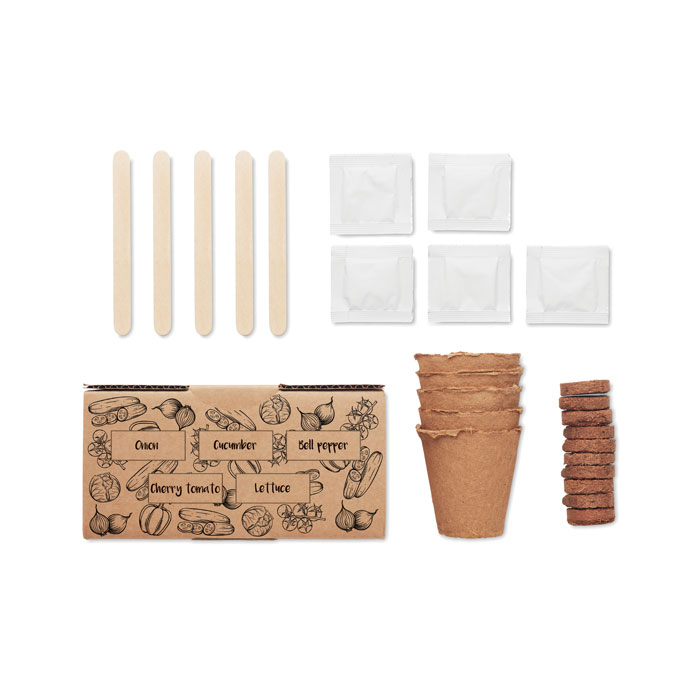 Kit de culture de salade. Boîte contenant des graines d'oignon, de concombre, de poivron, de tomate cerise et de laitue. Fabriqué dans l'UE. Tablette de terreau incluse.