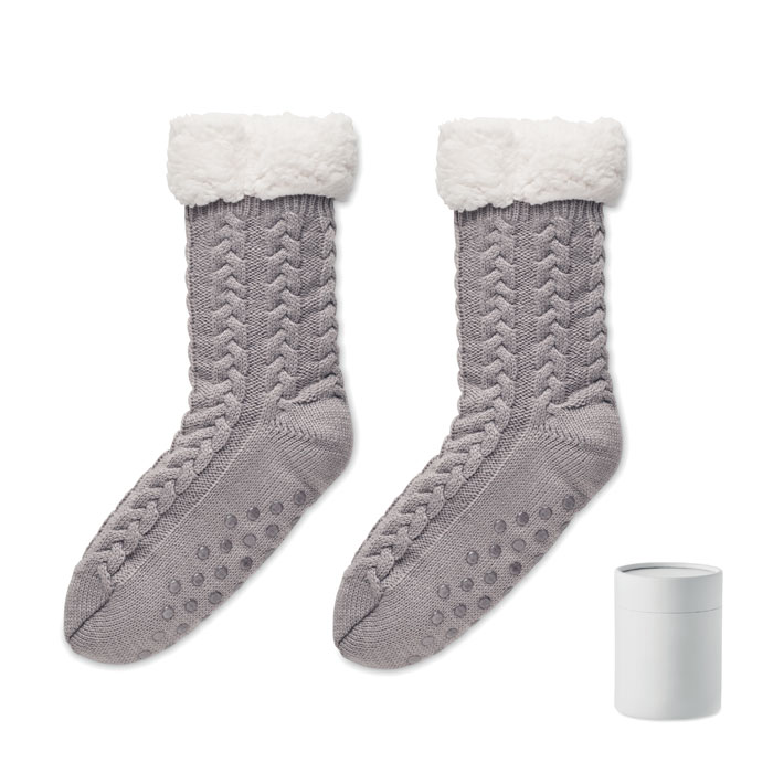 Chaussons chaussettes en tricot torsadé avec picots antidérapants sur la semelle en ficelle acrylique et doublure en faux sherpa 240 gr/m². Présentés dans un tube de papier. Taille L= 40-42.
