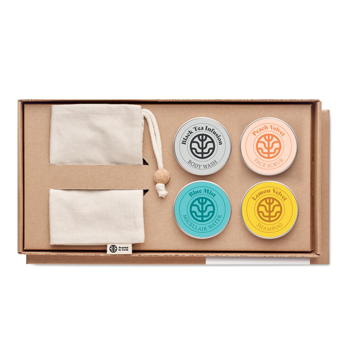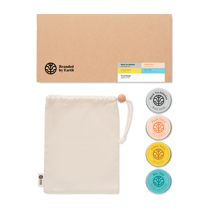 Set de voyage Branded By Earth. Comprend 50gr de gel douche vegan, un shampoing, un gommage pour le visage, une barre d'eau micellaire et une pochette en coton biologique. Emballage en papier. Boîte en papier recyclé. Fabriqué dans l'UE.