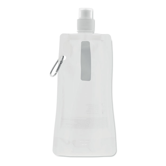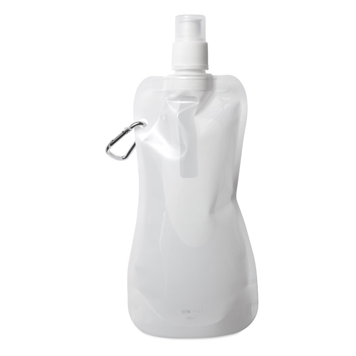 Gourde pliable en PET sans BPA, avec mousqueton en aluminium. Contenance 480 ml. Anti fuite.