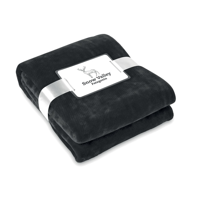 Couverture en polaire 280 gr/m² enveloppée dans un ruban et carte imprimable.