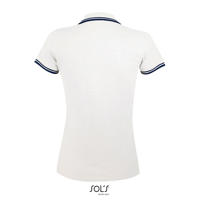 SOL'S PASADENA WOMEN, POLO FEMME, 100% coton peigné Ringspun Maille piquée 200, Col et bas de manches en bord côte, Bande de propreté au col, Manches courtes, Col et bas de manches rayés, contrastés, Patte de boutonnage 3 boutons ton sur ton, Coupe cintrée, Coupé cousu, Fentes latérales, Bouton de rechange sur couture intérieure côté, (1) Gris / Marine : 85 % coton / 15 % viscose, (2) Gris chiné / Orange : 85 % coton au size chart dans la documentation produit.